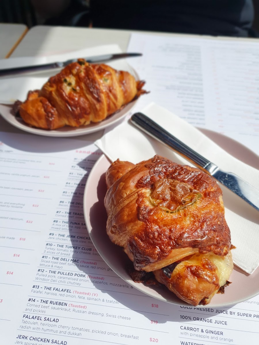 House-made Croissants baked fresh daily Plain, Cheese and Vegemite, Hamand Cheese, Jalapeno and Cheese and Almond (subject to availability)